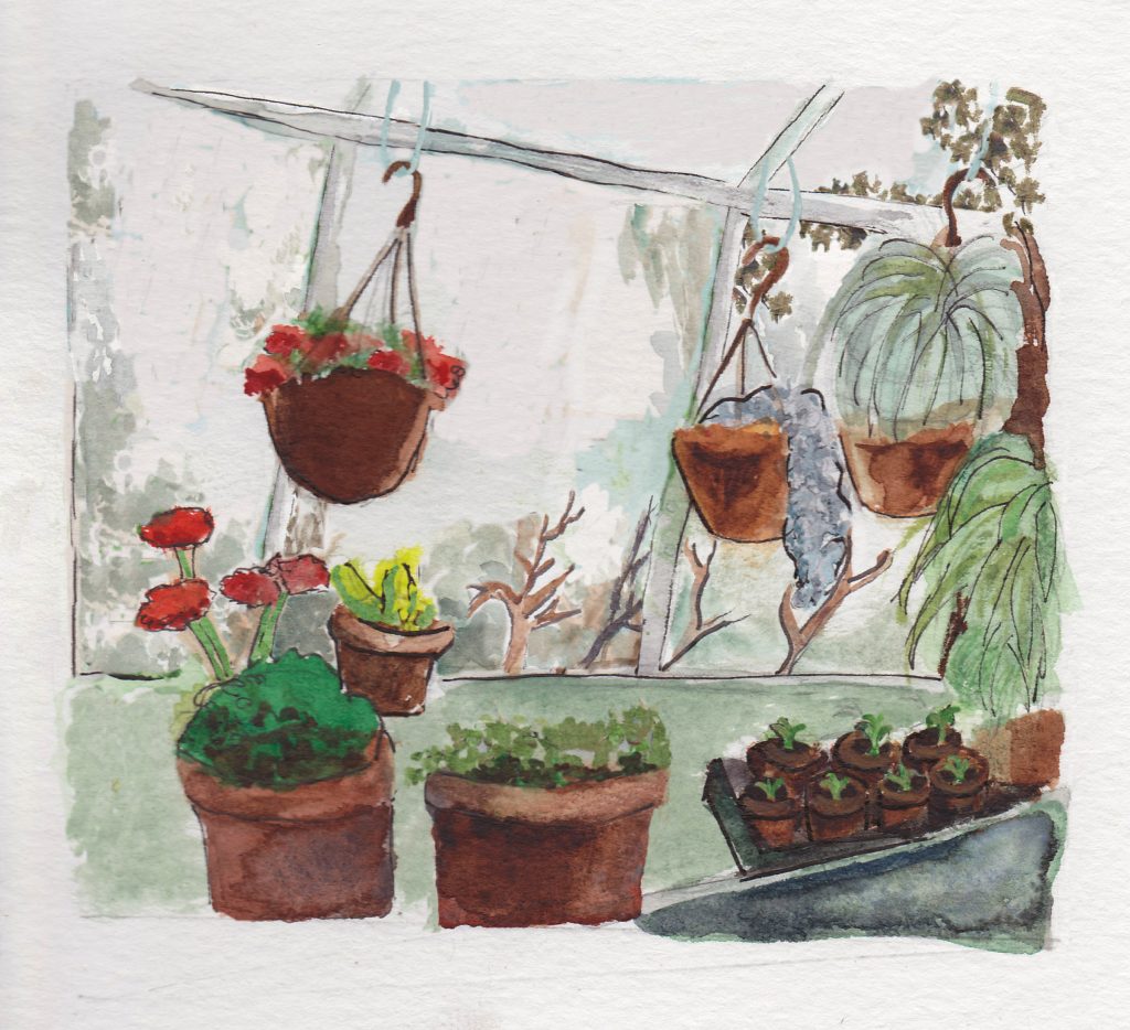 One of the things the small house had was an attached greenhouse. It was a sort of nursery for the young seedlings. The greenhouse was heated just enough so the plants would not freeze, but not too much as heating in the winter is costly. During the day, the winter sun would come across the house and warm the little greenhouse. The top half of the walls of the greenhouse were glass, and the roof of the greenhouse was glass as well. Red Geraniums Mother had kept from last summer hung in hanging baskets. If these plants were left outside through the winter, they would have died, but in the greenhouse they were protected and flourished. In the second week of February, Mother and Daisy noticed that for a half hour at 11:00 a.m., the greenhouse became very warm and toasty from the sun. With each passing week, the time lasted longer. The days, too, were getting longer, and the seeds could sense spring was coming. The plants that had been transitioned from the radiator to the greenhouse were now growing stronger. Mother showed how the seedlings needed nutrients in order to grow, so fertilizer was given periodically.