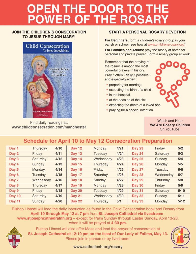 As Superintendent of Catholic Schools in the Diocese of Manchester, New Hampshire, I have advocated that whenever possible our Catholic School students have the opportunity to participate in daily Mass, pray the daily or weekly Rosary together, and experience weekly Eucharistic Adoration. Although some have questioned the apparent loss of academic time that these initiatives entail, objective evidence indicates that their implementation improves academic scores and more importantly lessens negative student interactions and behaviors. They promote a joyful and united school atmosphere. For these reasons I heartily welcome the Children’s Consecration to Jesus through Mary and the Children’s Rosary into our Catholic Schools.